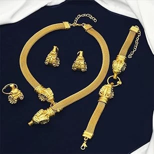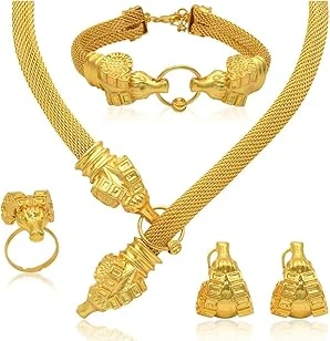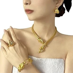 Azonee Gold Jewelry Set, Dubai Gold Necklace Set with Pendant African Nigerian 24K Jewelry Set Earrings and Bracelets Bridal Indian Fashion for Wedding