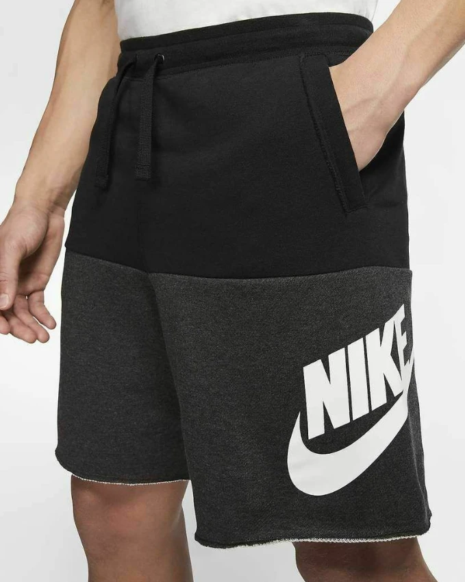 COLOR-BLOCKED COMFORT. The Nike Sportswear Alumni Shorts are designed with raw edges around the pockets and hem for a laid back look. The color-block design gives you bold, street-ready style. Soft and Stylish Looped back French terry fabric is soft against your skin while a color-block design offers a summer-ready look. Custom Fit Ribbed elastic waistband with drawcord offers a personalized fit. Product Details Large graphic on left leg Body/upper body/lower body: 58-59% cotton/23-25% rayon/17-18% polyester. Side pocket knuckle side: 100% cotton. Material percentages may vary.