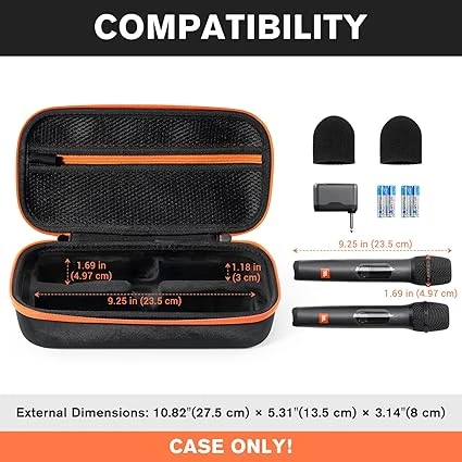 1. Exclusive for JBL wireless dual microphone systems. Provides separate space for two microphones, AA batteries, cables, and other accessories