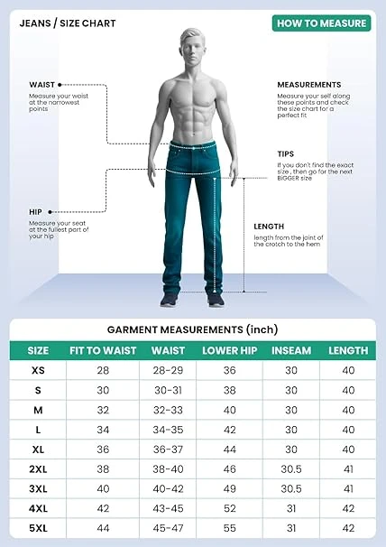 5. Size Guide : Please use image infographics and size charts for your perfect exercise jeans pant for men.