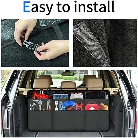 Practical Design: This trunk organizer has three straps are designed for cars that have two or three backseat headrests, suitable for most cars. This car trunk organizer has 5 large storage pockets and 2 small pockets, and 3 durable large pockets at the bottom for you to store heavy tools, ropes, first aid kits and other large items.