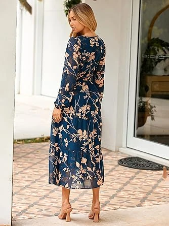 2. Feature: V neck is never basic. This flowy dress features a smocked waist, empire waist, tiered dress, elegant a line, and bold eye-catching floral to show off your sense, perfect for rocking this bohemian dress alone in the fall months