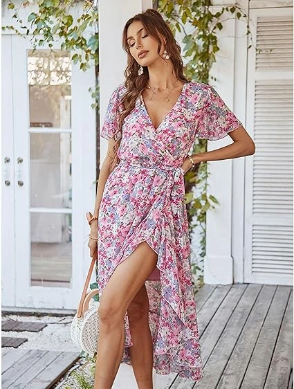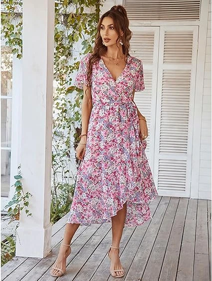 2. Features: Short sleeve dress, wrap v neck, a-line, floral patterned, casual swing dress, floral sundress, empire waist dress