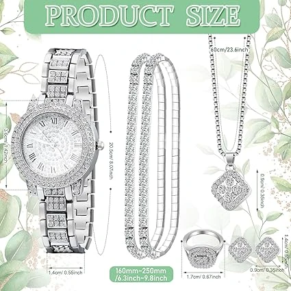 2. 🌹【Silver Watch for Women】:Case diameter: 3.6 inch, band width: 0.55 inch, band length: 8 inch; 2 Bracelets length: 6.3 inch-8 inch elastic; Ring Diameter: 0.67 inch; Necklace Length: 23.6inch, pendant diameter: 0.35 inch; Earring size: 0.35 inch x 0.5 inch